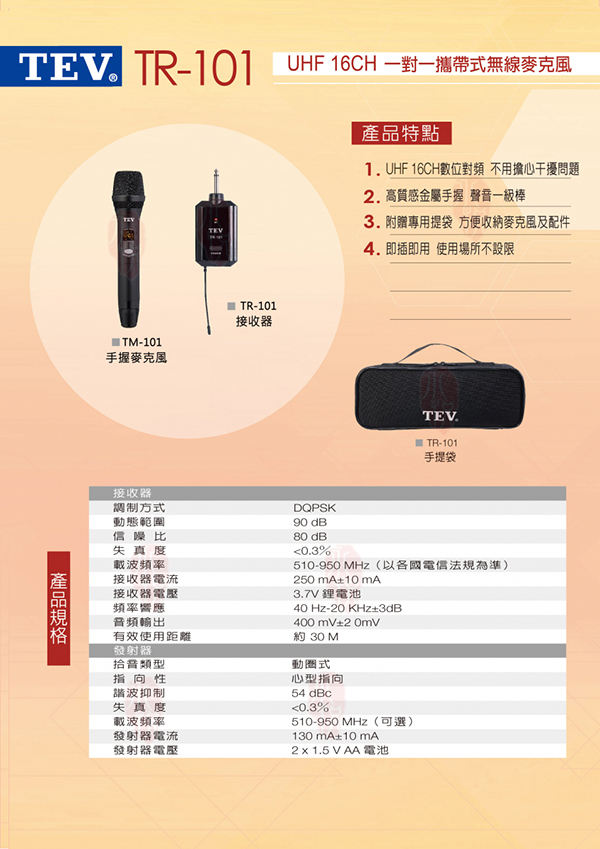 TEV TR-101(UHF一對一 16CH 攜帶式無線麥克風)
