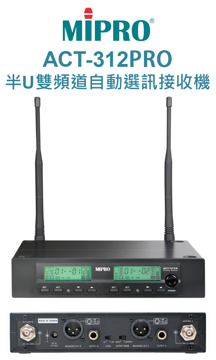 MIPRO ACT-312PRO 半U雙頻道自動選訊無線麥克風 (ACT-32H/MU80配件六擇一)
