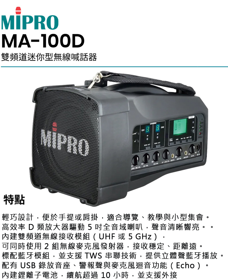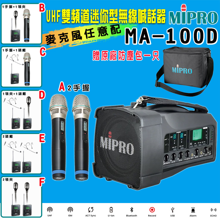 【MIPRO】MA-100D 雙頻道迷你型無線喊話器UHF(ACT-32H 配件六擇一)