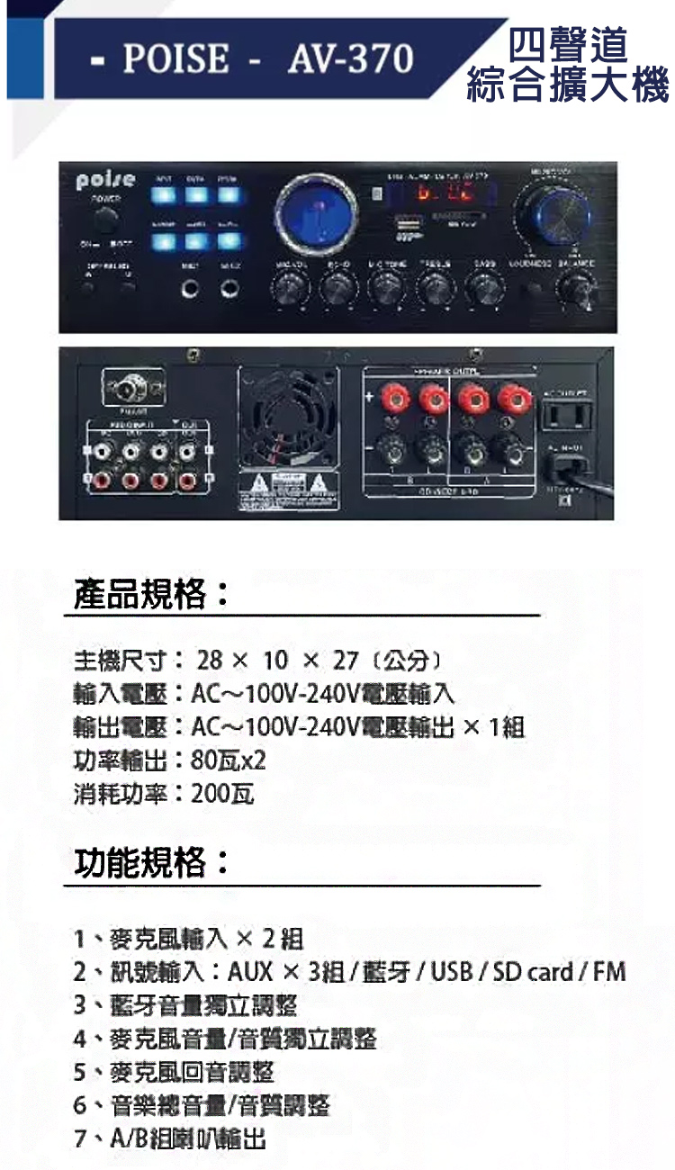 Poise AV-370BT 四聲道綜合擴大機(支援藍牙、FM、USB、SDcard、2MIC孔)