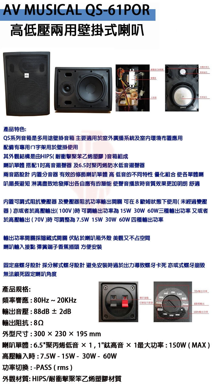 AV MUSICAL QS-61POR(黑/白)高低壓兩用壁掛式喇叭(對)全新公司貨