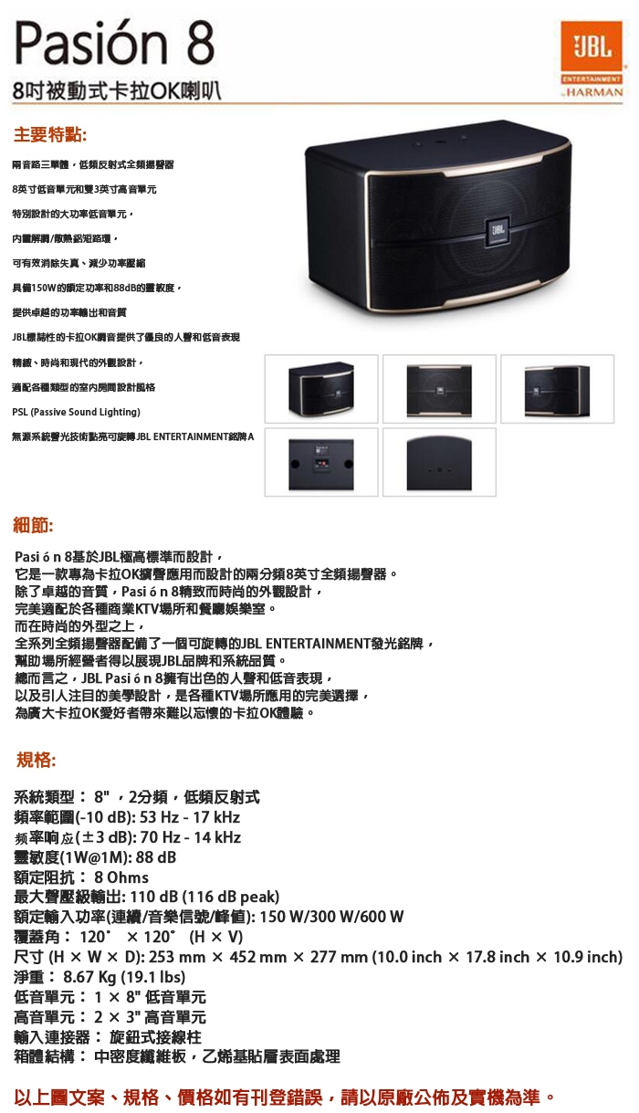 JBL Pasion 8 卡拉OK喇叭 (對) 全新公司貨