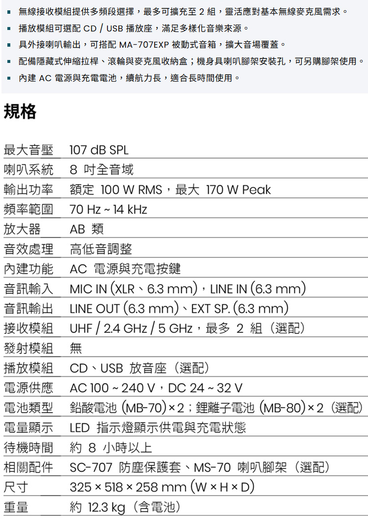 【MIPRO】MA-707 經典型無線擴音機配CD/USB(ACT-240H)