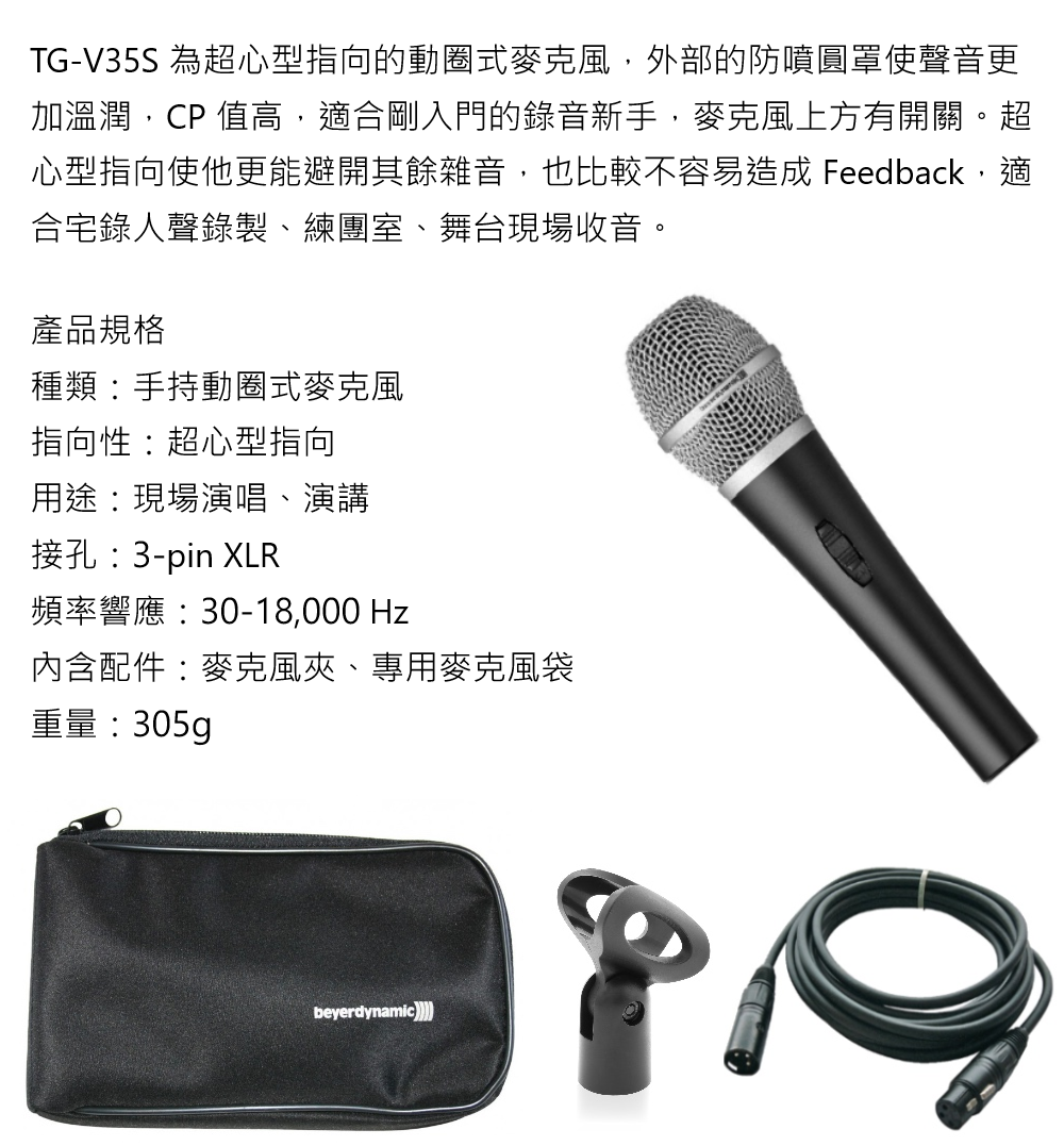 BeyerDynamic TG V35S 動圈式麥克風 含收納袋+麥克風夾/線6M 正成公司貨 2年保固