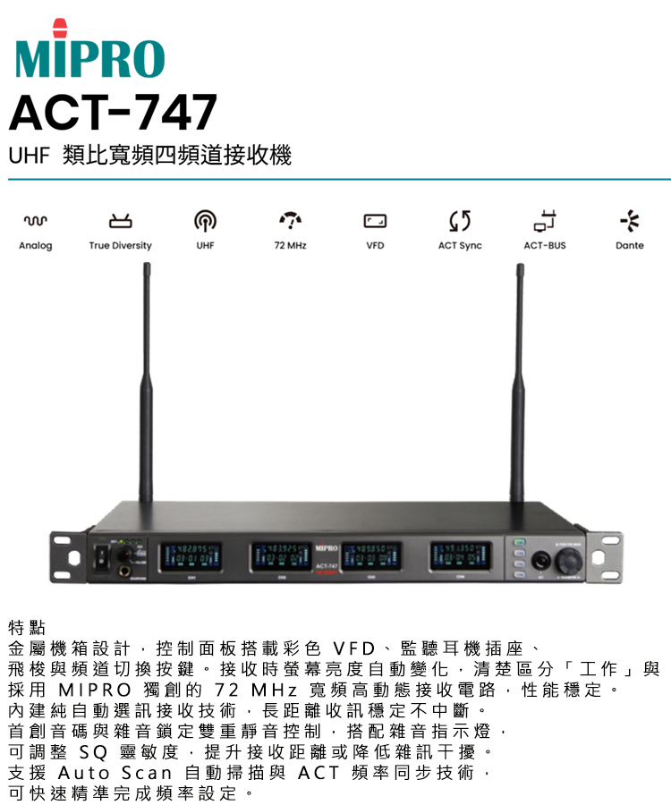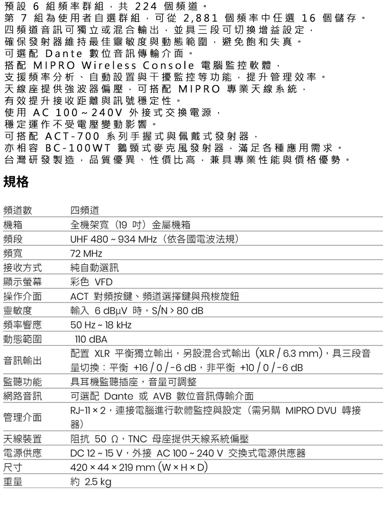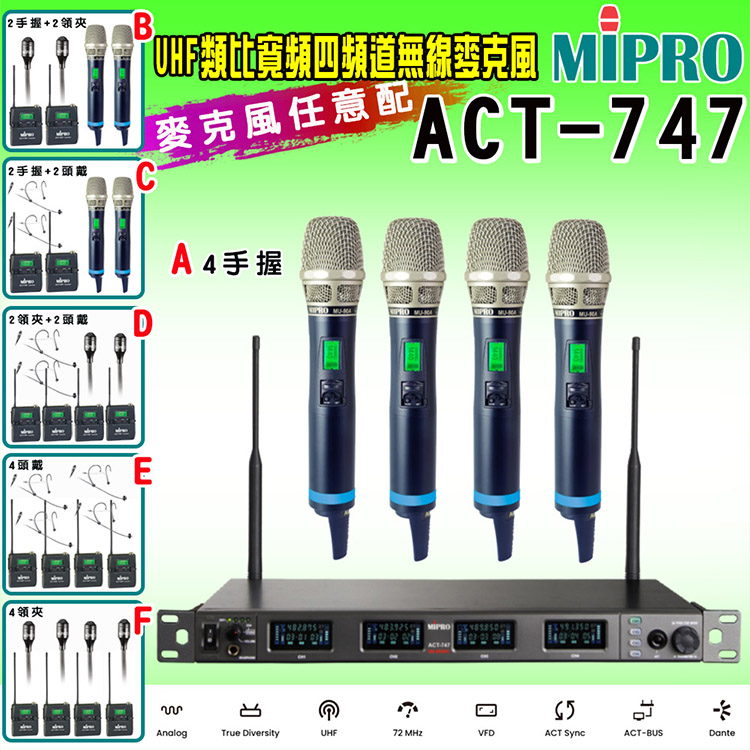 【MIPRO】ACT-747 類比寬頻四頻道無線麥克風UHF(ACT-700H/MU90A 配件六擇一)
