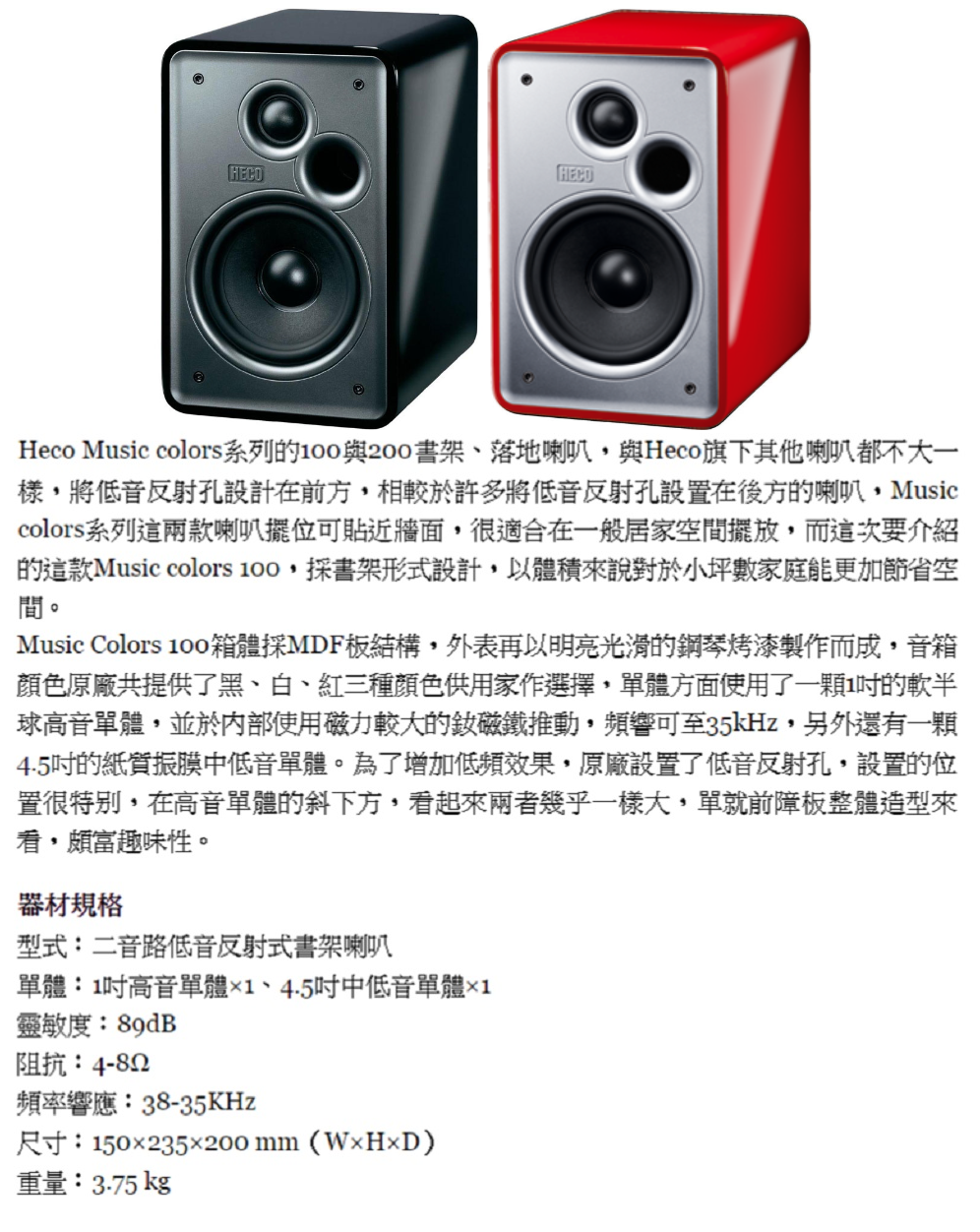 HECO Music Colors 100 書架式鑑聽喇叭(紅/黑)(對) 全新公司貨