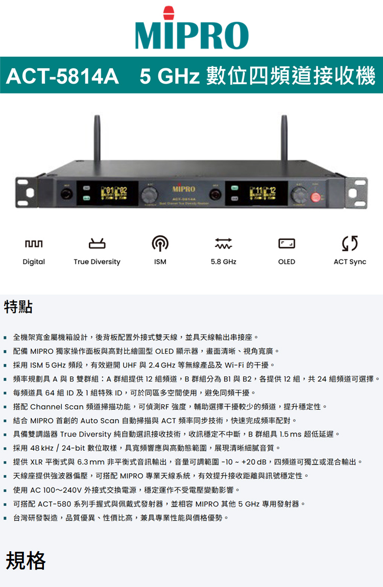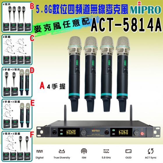 【MIPRO】ACT-5814A 數位四頻道無線麥克風5.8G(ACT-580H 配件六擇一)