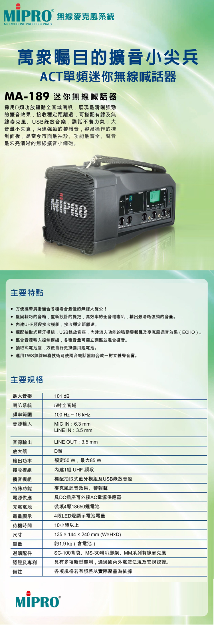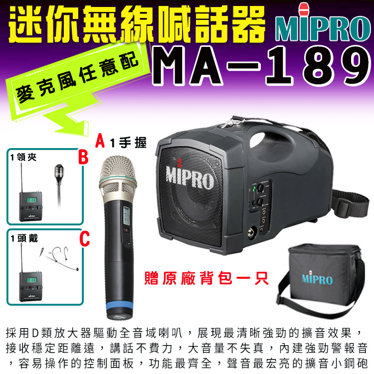MIPRO MA-189 UHF單頻道迷你型無線喊話器 (ACT-32H 配件三擇一)