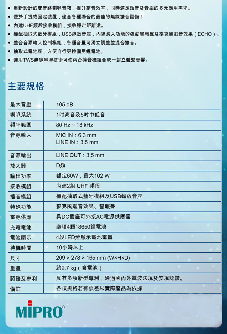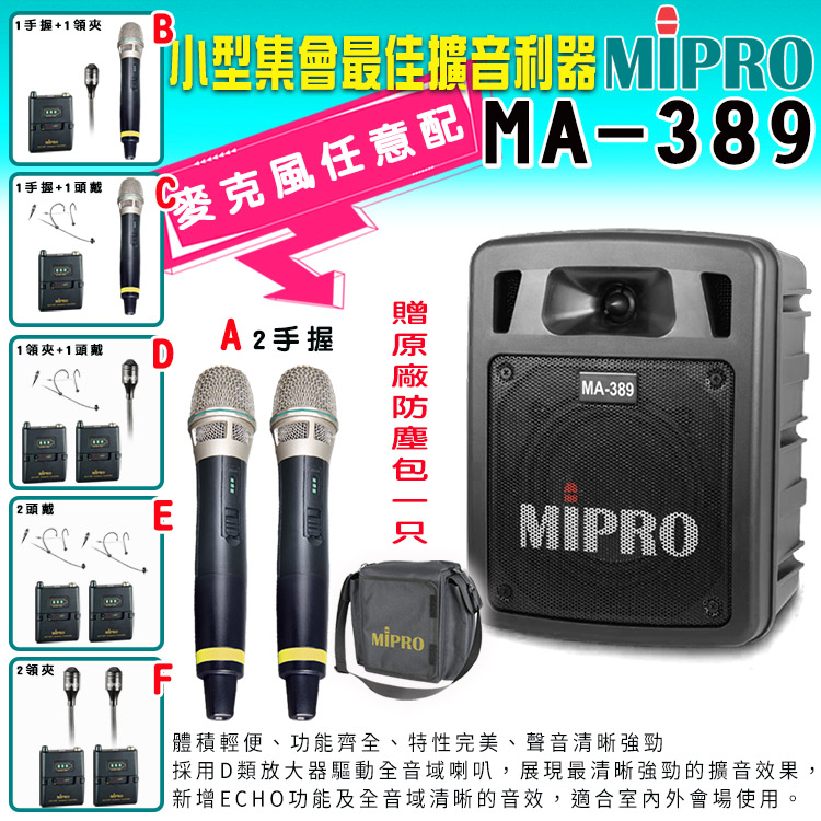 MIPRO MA-389 雙頻道迷你無線擴音機 (ACT-58H 配件六擇一)