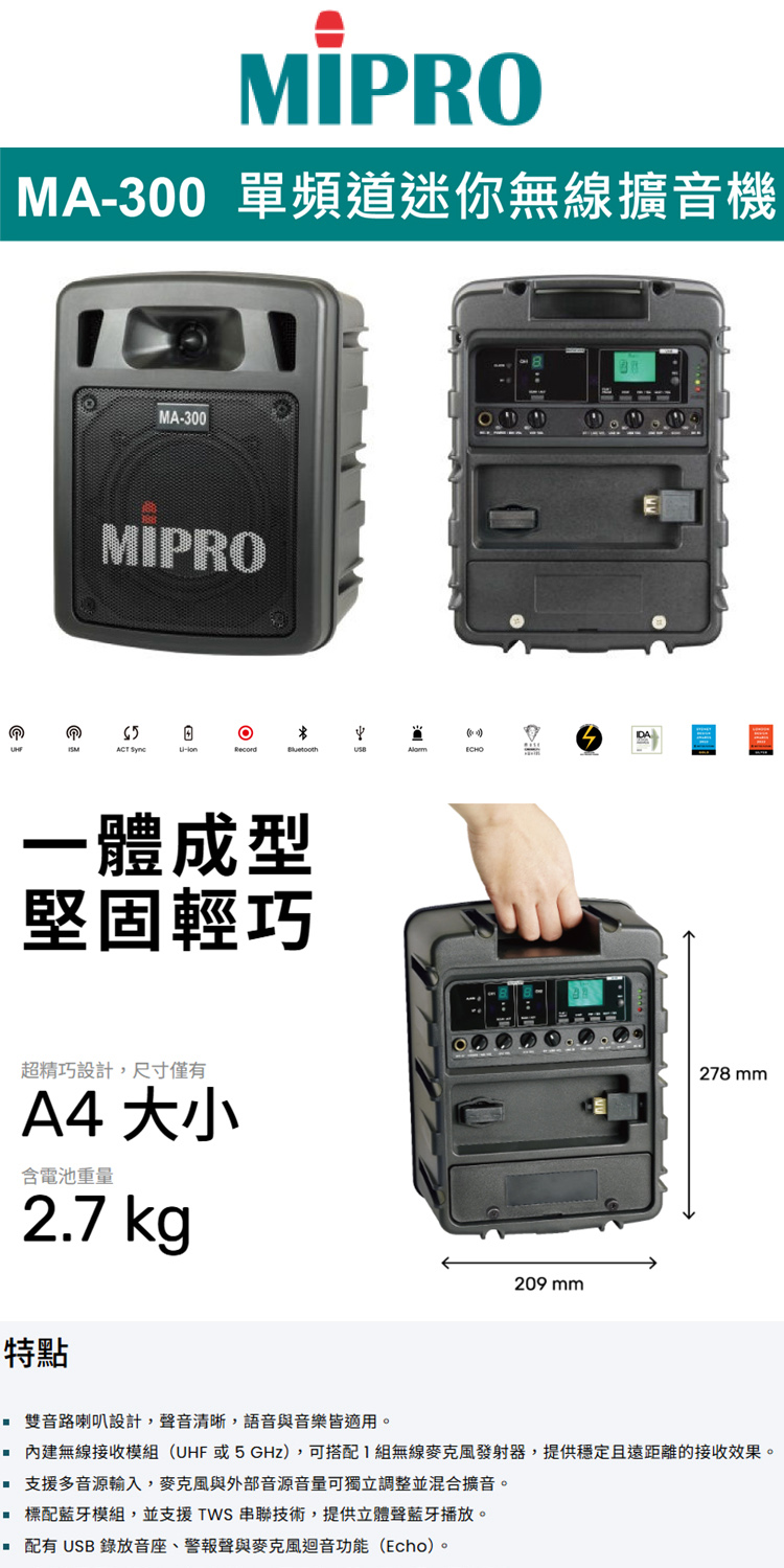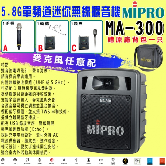 【MIPRO】MA-300 單頻道迷你無線擴音機5.8G (ACT-58H 配件三擇一)
