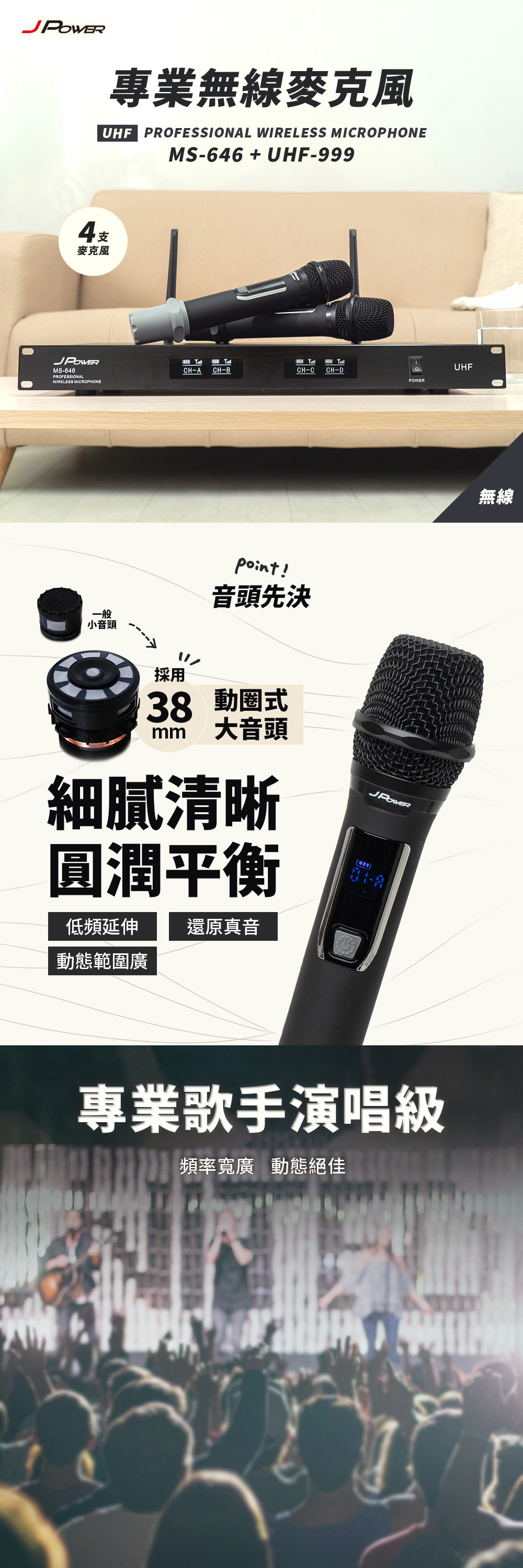 JPOWER MS-646/UHF999 手持四支專業無線麥克風 全新公司貨