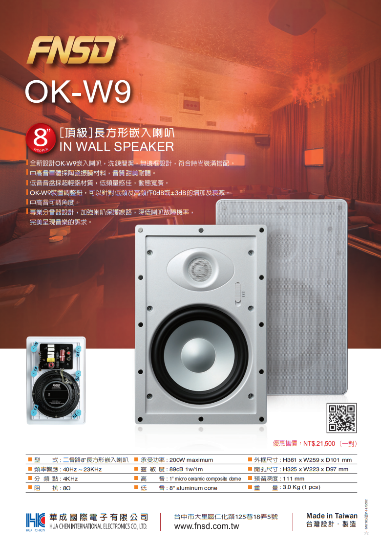 FNSD OK-W9 長方形崁入式喇叭 (對) 贈SPK-200B喇叭線25M 全新公司貨