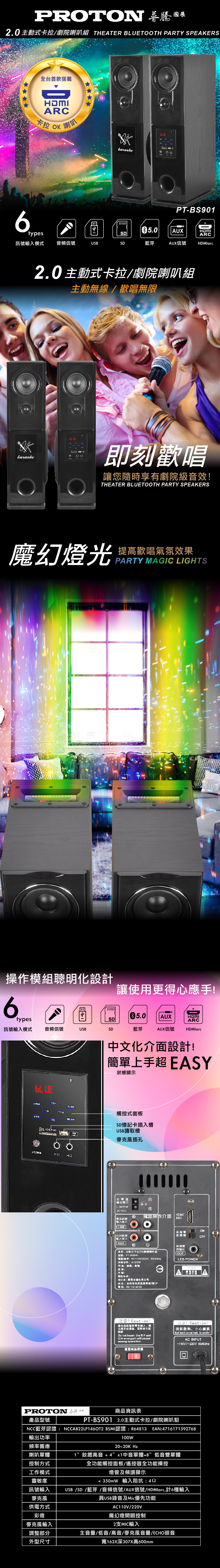 PROTON PT-BS901 2.0主動式卡拉/劇院喇叭組 (對) 贈POISE U10麥克風一組 全新公司貨