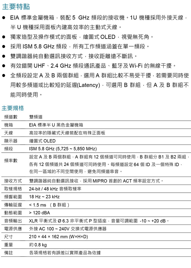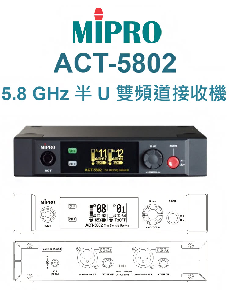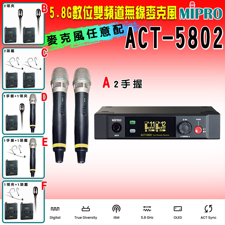 【MIPRO】ACT-5802 數位雙頻道無線麥克風5.8G(ACT-58H 配件六擇一)