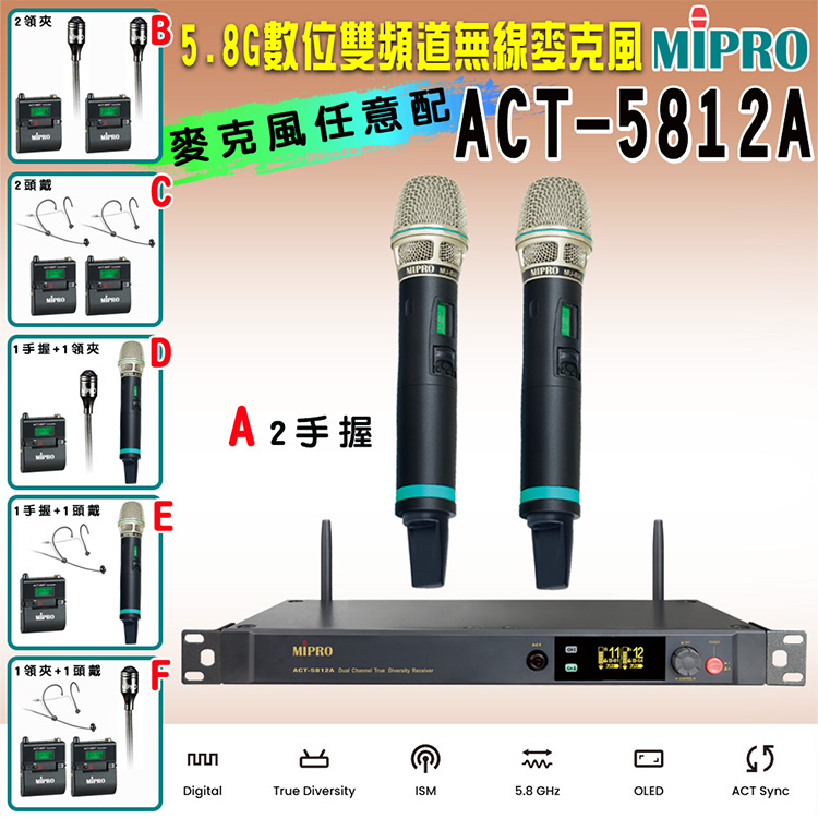【MIPRO】ACT-5812A 數位雙頻道無線麥克風5.8G(ACT-580H 配件六擇一)