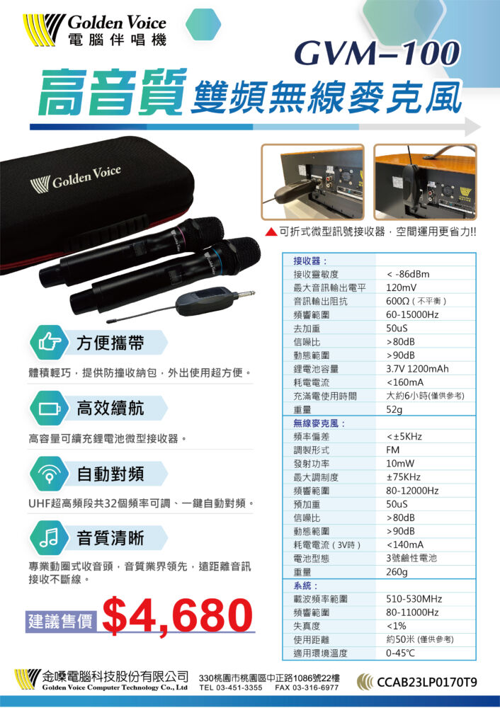 Golden Voice GVM-100 高音質雙頻無線麥克風 贈二好禮 全新公司貨