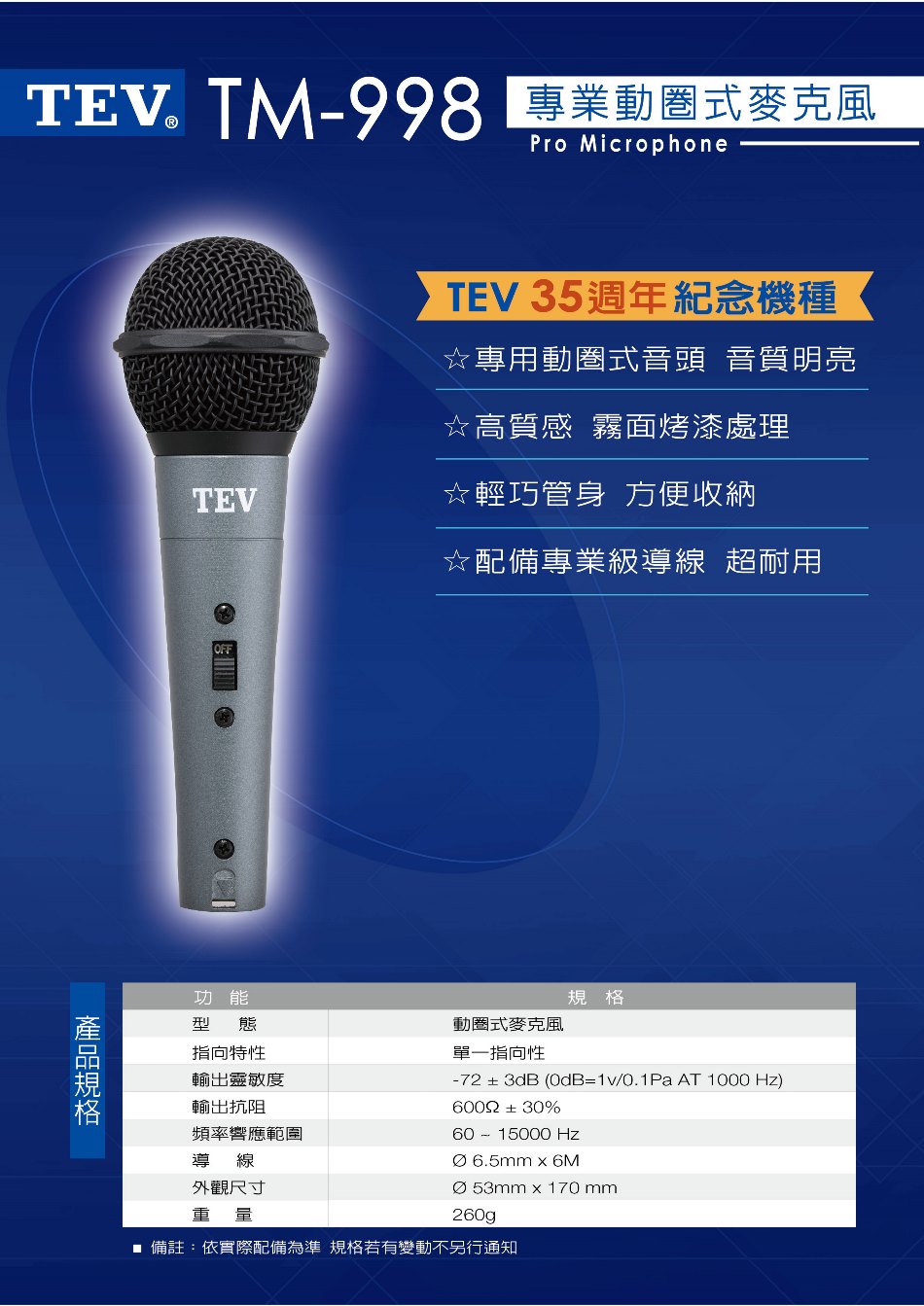 TEV TM-998 專業動圈式麥克風 全新公司貨