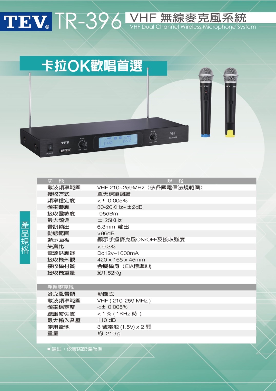 TEV TR-396 VHF無線麥克風 雙手握 贈二好禮 全新公司貨