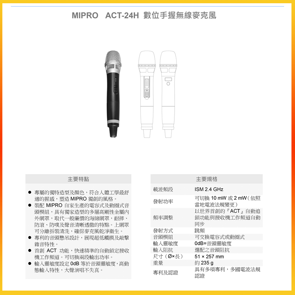 標配ACT-240H手握式發射器及ACT-240T佩戴式發射器。