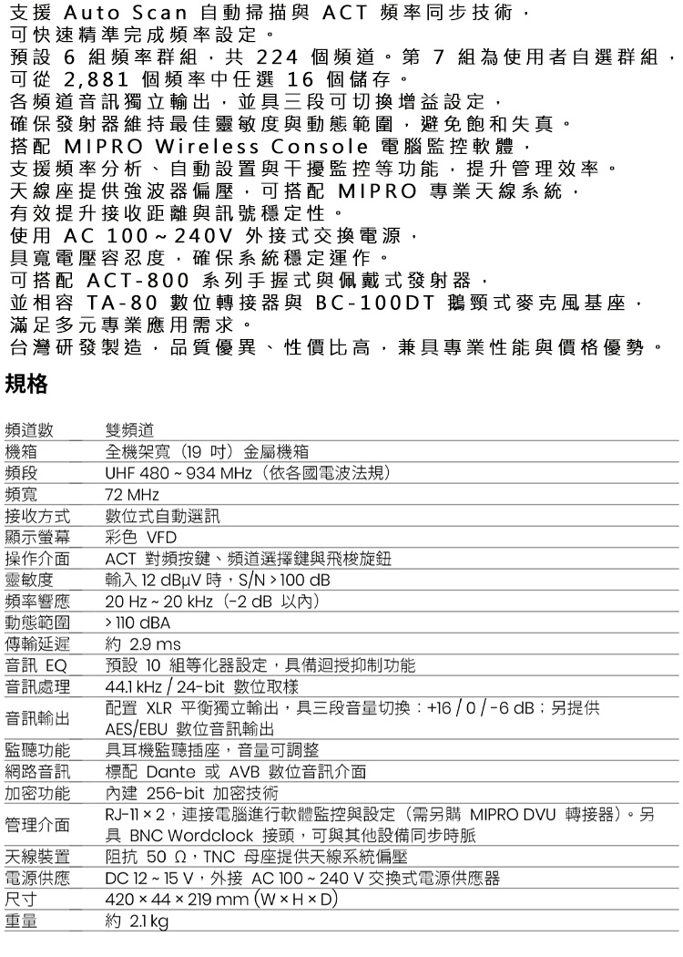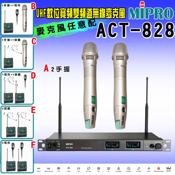 【MIPRO】ACT-828 數位寬頻雙頻道無線麥克風UHF(ACT-80H/MU90 配件六擇一)