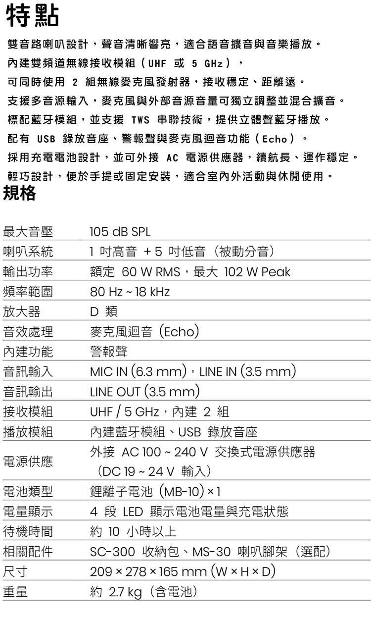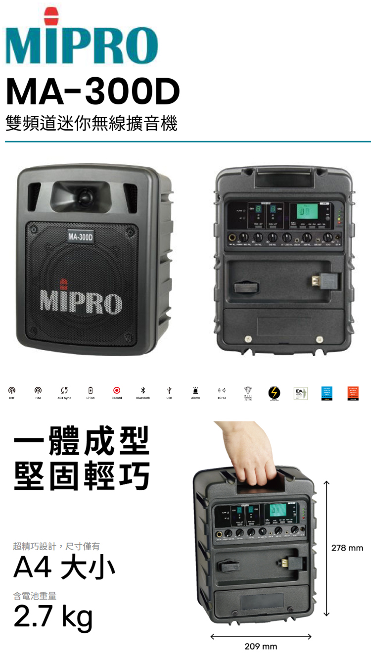 【MIPRO】MA-300D 雙頻道迷你無線擴音機UHF (ACT-32H 配件六擇一)