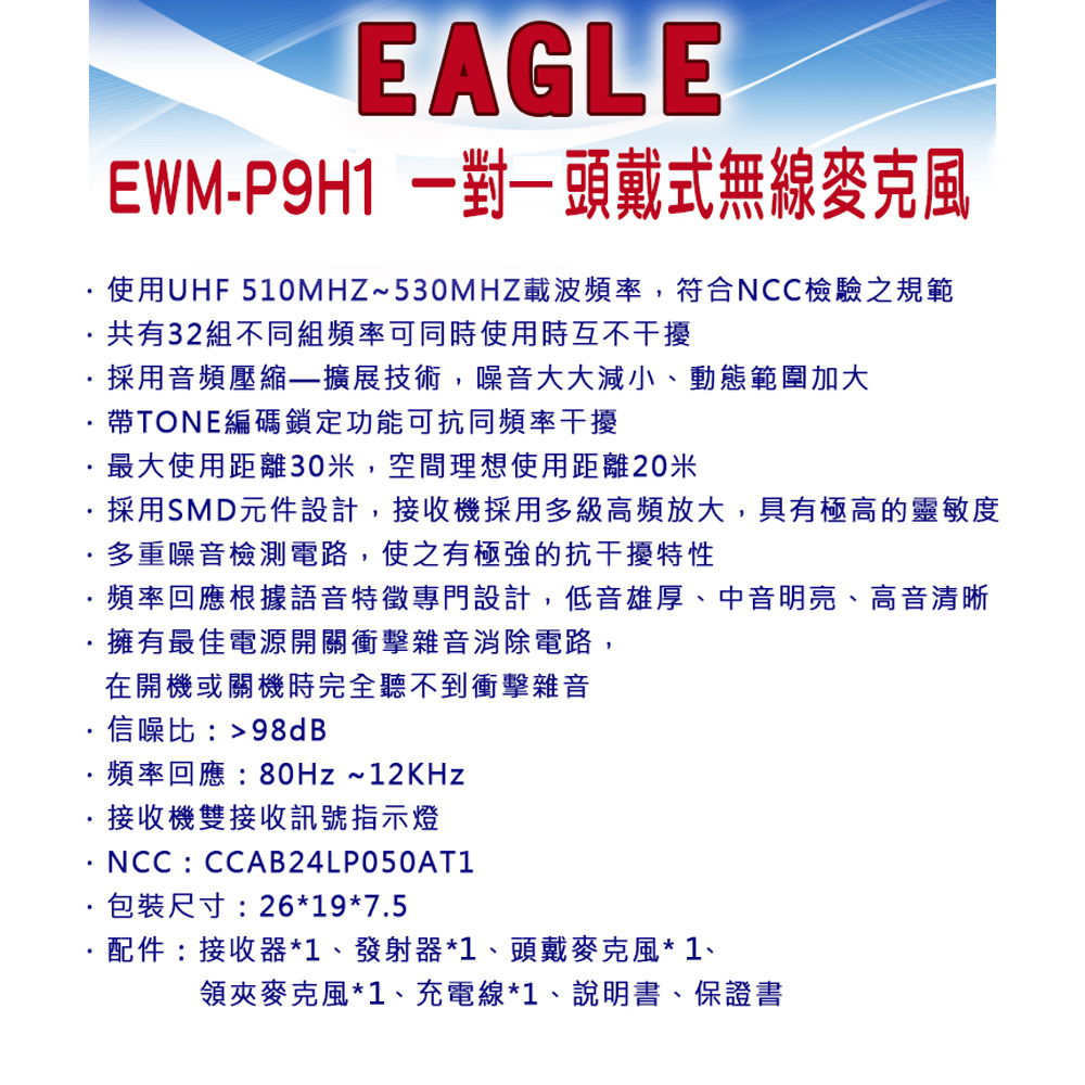 EAGLE EWM-P9H1 一對一頭戴式無線麥克風 全新公司貨