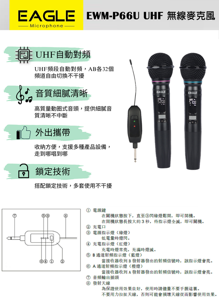 EAGLE EWM-P66U UHF 高音質雙頻 無線麥克風組(最新版)