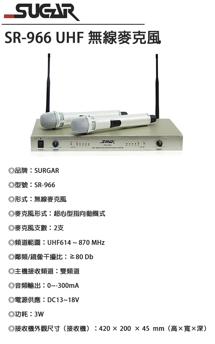 SUGAR SR-966 UHF 雙頻道無線麥克風 全新公司貨