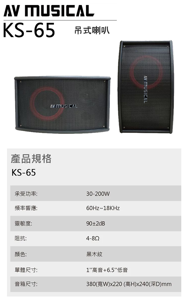 AVMUSICAL KS-65 吊式專業用喇叭一對(商業空間播放音樂或家用)