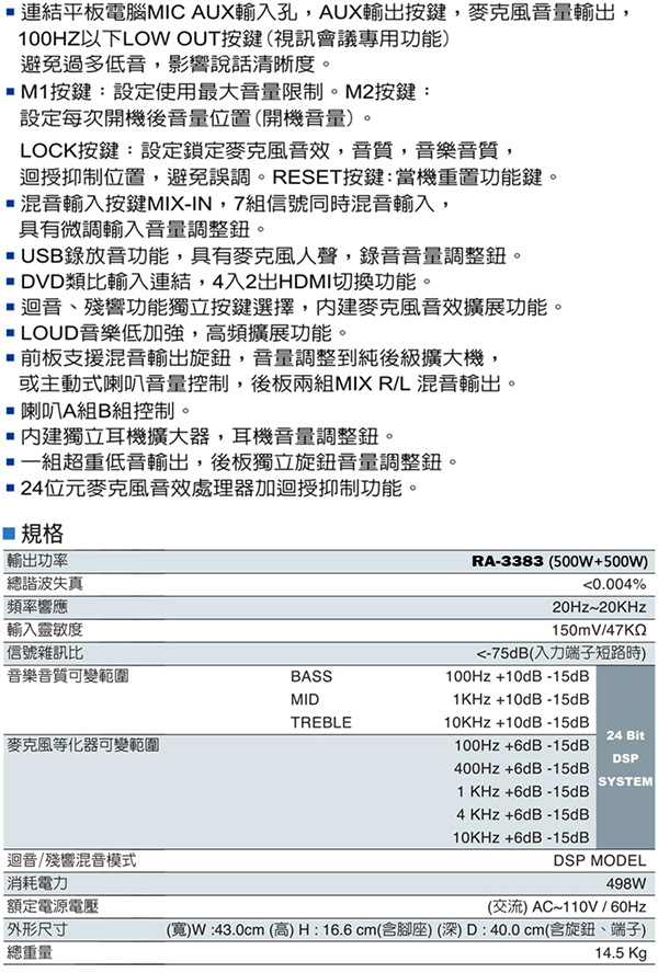 FNSD RA-3383(500W+500W高功率混音擴大機)
