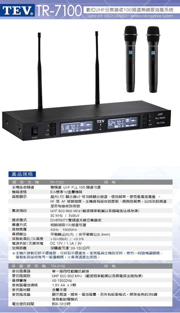TEV TR-7100(數位UHF 真分集接收 100頻道 無線麥克風2支)