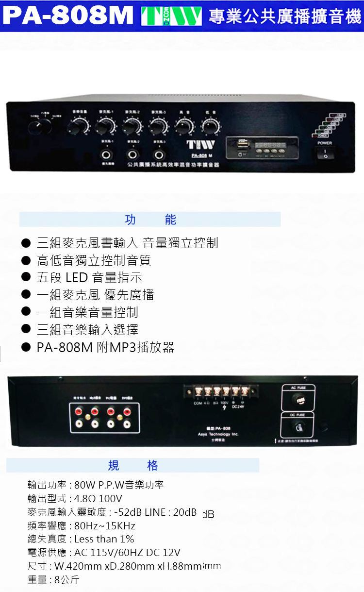 TIW PA-808M 專業廣播擴大機80W/附MP3播放器