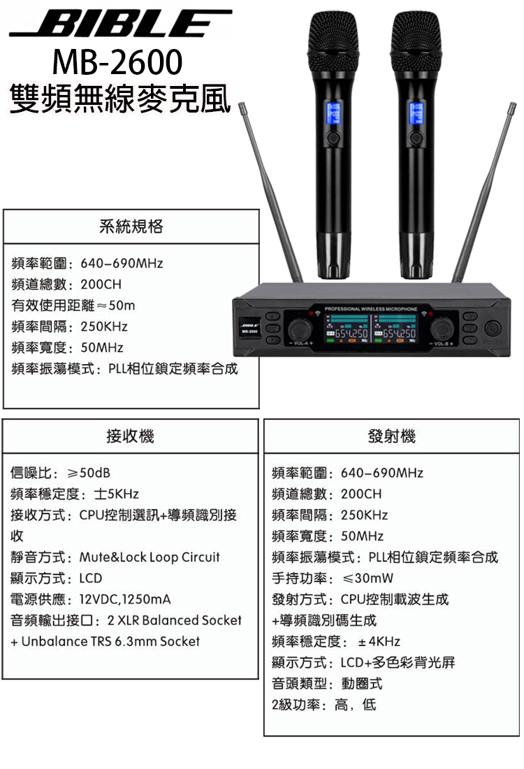 BIBLE MB-2600(專業歌唱雙頻道無線麥克風)