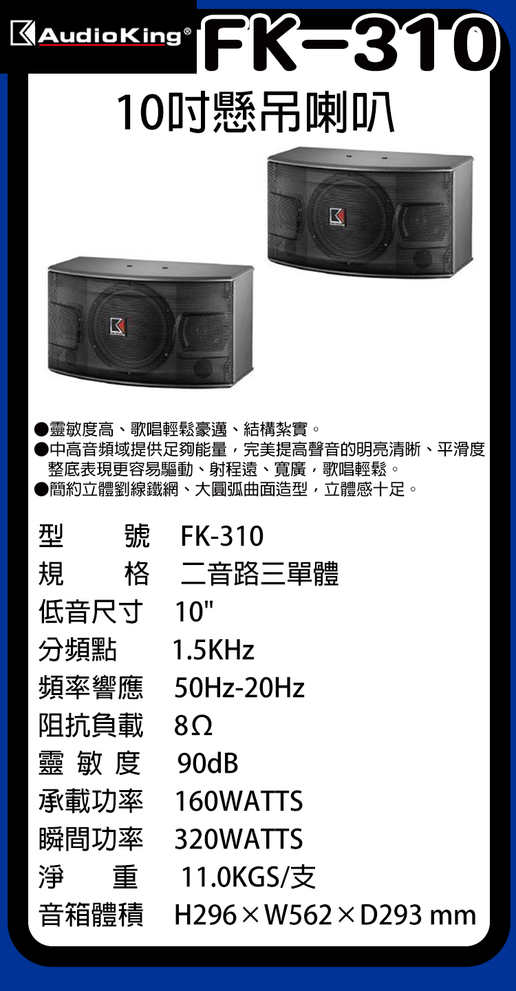 AudioKing FK-310 10吋兩音路懸吊喇叭
