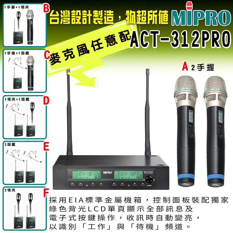 MIPRO ACT-312PRO 半U雙頻道自動選訊無線麥克風 (ACT-32H/MU80配件六擇一)