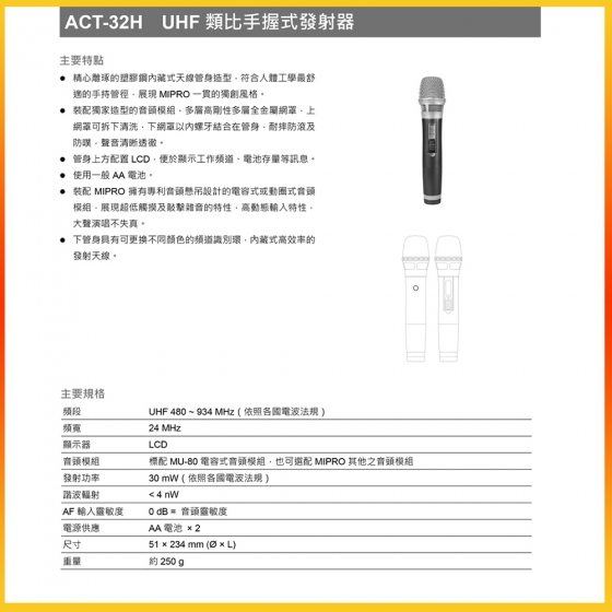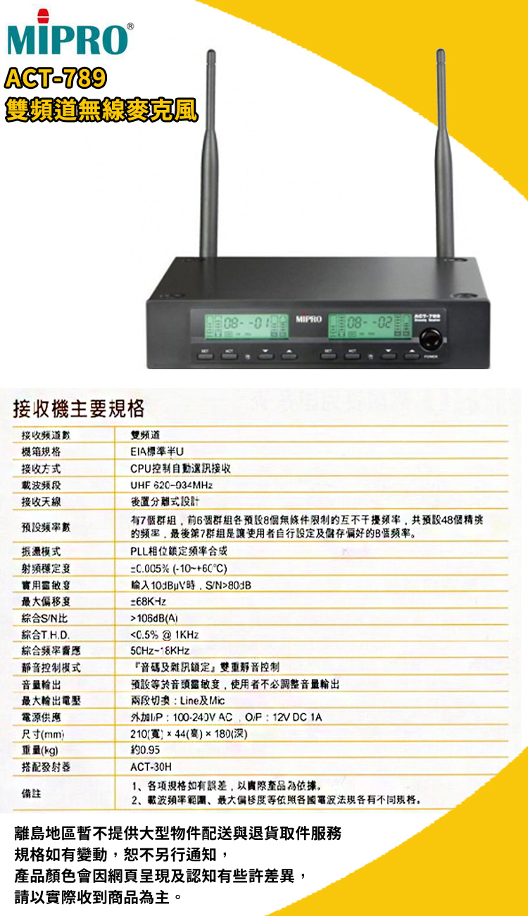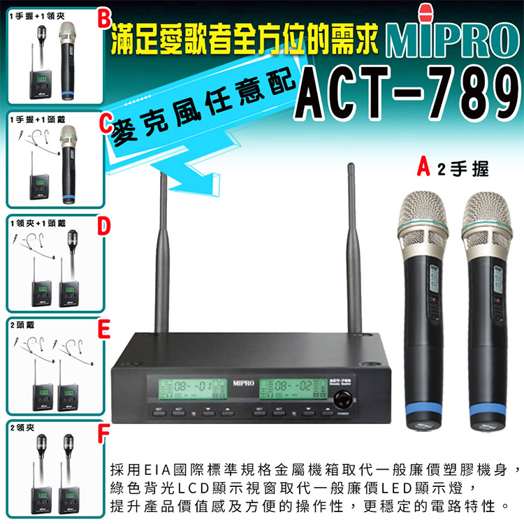MIPRO ACT-789 雙頻道無線麥克風 (ACT-32H/MU90配件六擇一)