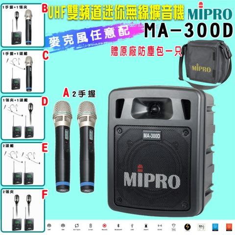 【MIPRO】MA-300D 雙頻道迷你無線擴音機UHF (ACT-32H 配件六擇一)