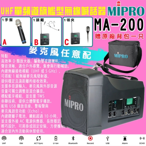【MIPRO】MA-200 單頻道旗艦型無線喊話器UHF (ACT-32H 配件三擇一)